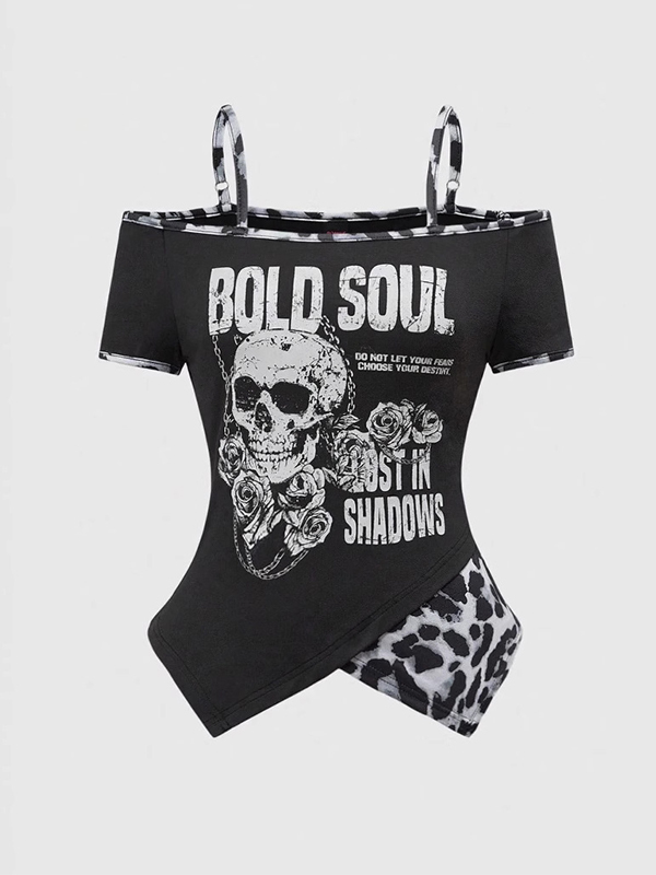 Kurzarm-T-Shirt mit One-Shoulder-Totenkopf-Print