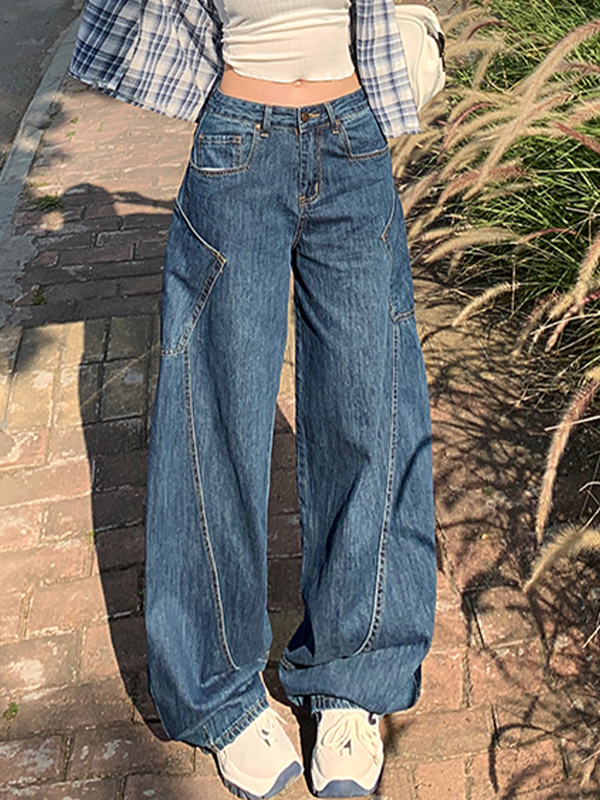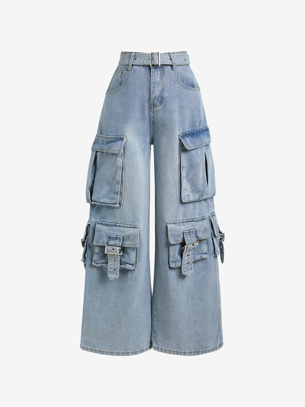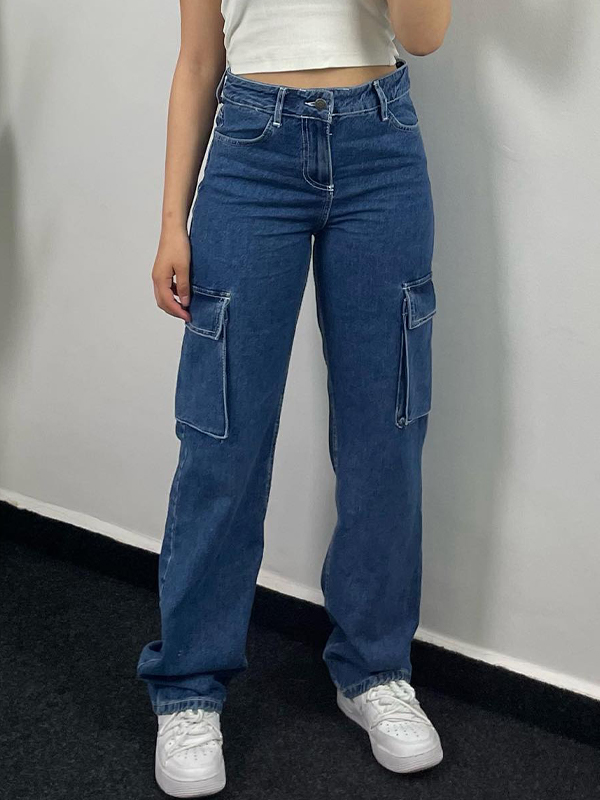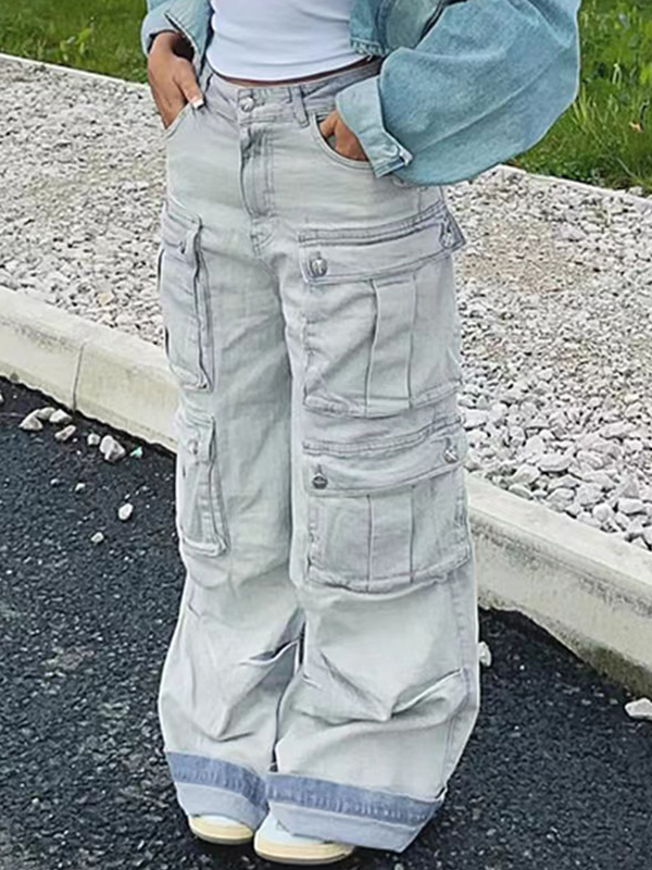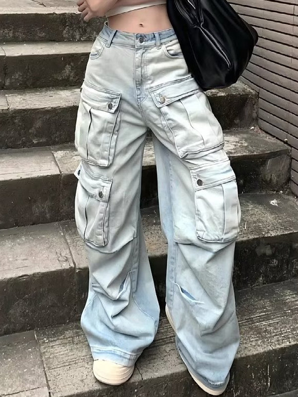 Hellblaue, locker sitzende Cargo-Jeans mit mehreren Taschen