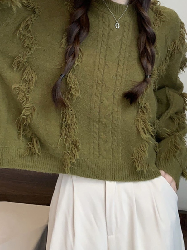 Einfarbiger Pullover mit Zopfmuster und Quasten