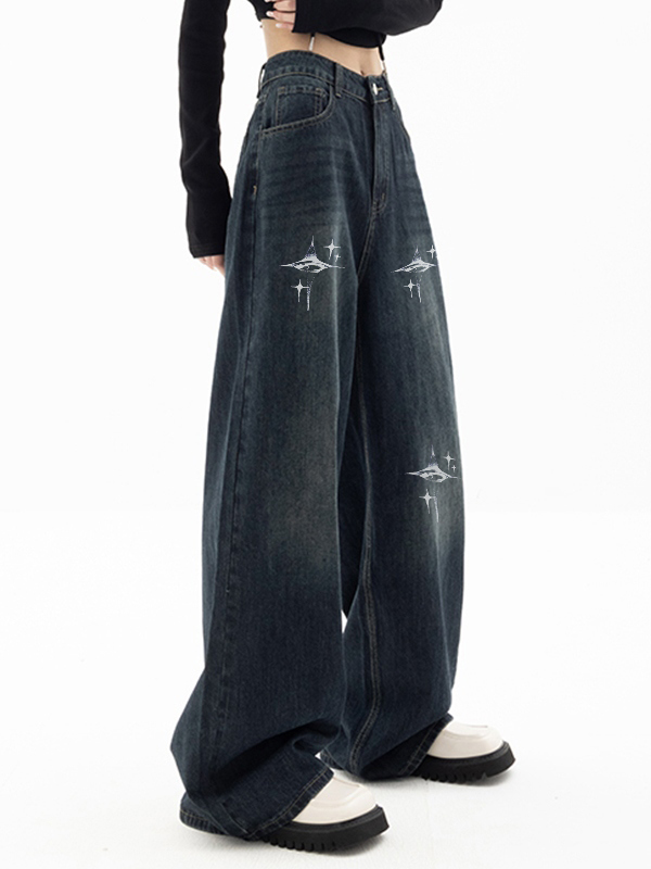 Vintage blaue Boyfriend-Jeans mit 90er-Jahre-Print